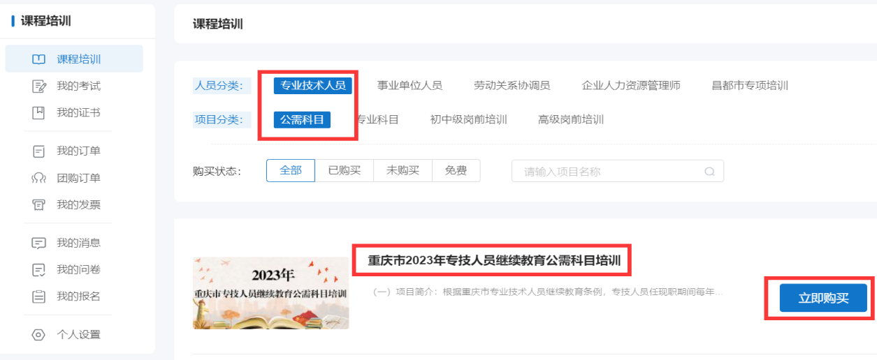 登录后在首页“在线学习中心”选择“公需科目”进入网络学习平台,选择“重庆市2023年专技人员继续教育公需科目培训”培训项目,点击“立即购买”按钮,进入项目购买页面。
